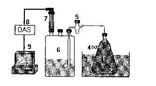 Para lograr el objetivo propuesto y para eliminar los inconvenientes de los sistemas respirométricos actualmente empleados el sistema que se propone y que se representa en la figura 1 consta de: (1) Reactor, en el que transcurre el proceso de digestión anaerobia que quiere estudiarse. La masa en reacción ocupa la práctica totalidad del volumen del recipiente, de modo que el volumen de la zona superior, ocupado inicialmente por aire es despreciable, lo que permite evitar la etapa de eliminación de oxígeno por lavado con gas inerte. (2) Agitador magnético, para conseguir una buena homogeneización de la masa en reacción. (3) Baño o cámara de termostación, para mantener una temperatura de reacción adecuada. (4) Toma de muestras líquidas, lo que permite seguir la evolución de los Ácidos Grasos Volátiles (AGV) . (5) Toma de muestras de la fase gaseosa, equipado con "septum", lo que permite analizar la composición actual del biogás que se produce. (6) Recipiente de recogida de gas de volumen conocido. El gas sale a través de un difusor de burbuja fina y atraviesa el líquido. Utilizando una disolución de NaOH como líquido de absorción, la fase gaseosa queda constituida únicamente por metano. (7) . Transductor de presión que mide, en tiempos prefijados, la presión de metano en el recipiente. (8) Sistema de adquisición de datos (9) Ordenador personal, que registra, almacena y trata los datos ofreciendo curvas de evolución temporal e informes finales con valores de los parámetros.