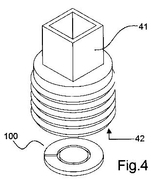 En la figura 3 se puede observar como la prótesis objeto de la invención ha sido integrada en la cavidad del oído medio (2) , actuando directamente sobre la ventana oval (32) , y reemplazando totalmente la cadena osicular (22) del oído medio (2) , adaptándose a las dimensiones de dicha ventana oval (32) , que son del entorno de 1 mm. Esta prótesis es, en sí misma, un tornillo (41) que porta un transductor microelectromecánico (100) configurado para transformar señales eléctricas procedentes de un procesador de señal (no mostrado en las figuras adjuntas) en vibraciones que inciden directamente sobre la ventana oval (32) en pacientes que han perdido la cadena osicular (22) : martillo (221) - yunque (222) - estribo (223) .