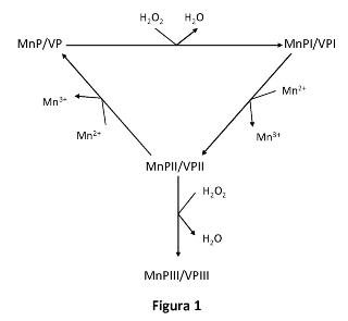 El ciclo catalítico de las enzimas MnP y VP se inicia con la oxidación, mediante H2O2, de la enzima en su estado original para formar la especie oxidada MnPI/VPI, que es dos estados de oxidación superior a la forma nativa. Este compuesto es reducido por un ión de Mn2+, que se oxida a Mn3+, pasando a la forma MnPII/VPII, un estado de oxidación superior a la forma nativa de la enzima. Finalmente esta forma oxida otro ión de Mn2+, para formar Mn3+, y vuelve a su forma nativa MnP/VP. Un exceso de concentración de H2O2 puede conducir a la formación de la especie inactiva de la enzima MnPIII/VPIII. Este ciclo catalítico se muestra en la figura 1.