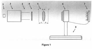 donde el sistema óptico del cual se quieren determinar los parámetros o sistema óptico incógnita 5, se sitúa entre la red de difracción 4 y el sistema de detección 6, a lo largo del eje óptico.