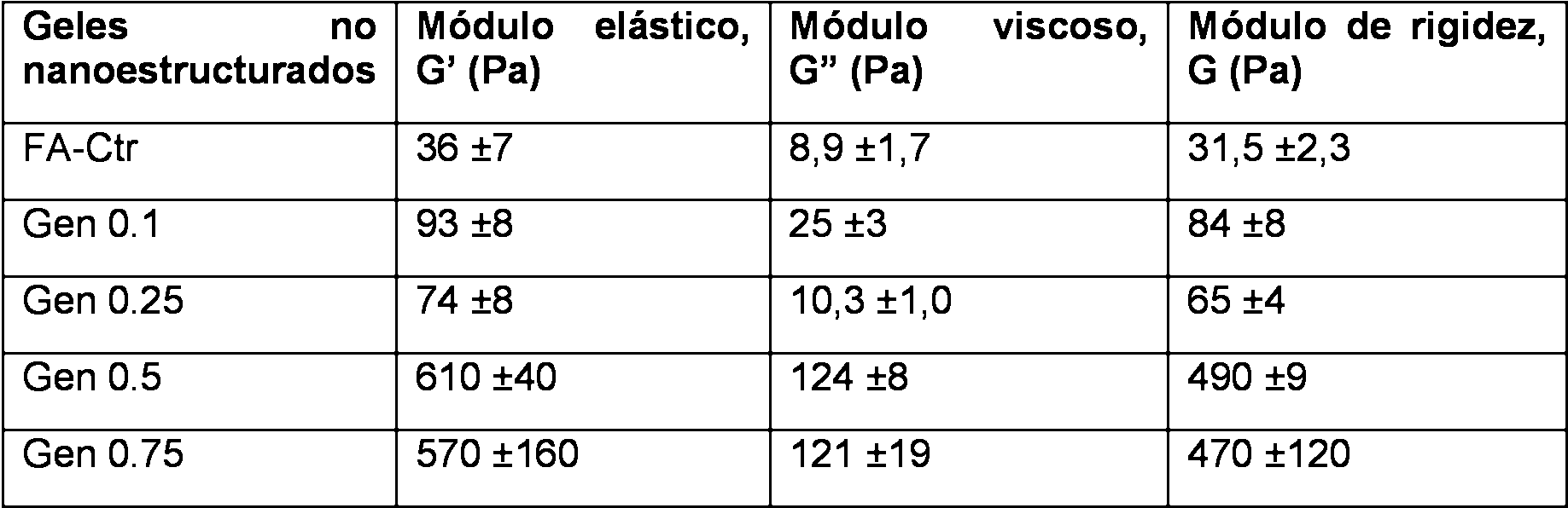 Tabla 1. Valor del módulo de rigidez, el módulo elástico y el módulo viscoso correspondiente a la zona viscoelástica lineal (correspondiente a una deformación de 5 corte de 0, 01 y una frecuencia de 1Hz) de los hidrogeles no nanoestructurados. Se indica la concentración en % v/v de agente químico Genipin.