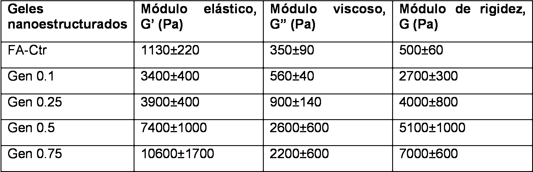 Tabla 2. Valor del módulo de rigidez, el módulo elástico y el módulo viscoso correspondiente a la zona viscoelástica lineal (correspondiente a una deformación de corte de 0, 01 y una frecuencia de 1Hz) de los hidrogeles nanoestructurados. Se indica la concentración en % v/v de agente químico Genipin.