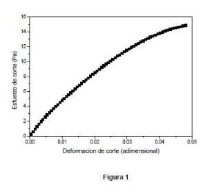 (i) Estado estacionario. En este tipo de ensayo, la muestra se somete a una rampa de esfuerzos de corte, midiéndose para cada valor el esfuerzo de corte necesario para mantener la deformación en estado estacionario. En los experimentos realizados, se mantuvo cada valor de deformación aplicada durante 10 s. Este proceso 25 se repitió para valores crecientes de deformación (rampa de deformación) hasta alcanzarse la zona de dependencia esfuerzo-deformación no lineal. Una dependencia típica del esfuerzo con la deformación de cizalla para este tipo de experimentos se muestra en la Figura 1. Como se puede observar, a bajos valores de la deformación existe una dependencia aproximadamente lineal del esfuerzo con la deformación. A 30 medida que aumenta la deformación aplicada, la linealidad comienza a perderse, tomando la curva una forma cóncava, que indica que la deformación sucesiva del material es más fácil a medida que este se encuentra más deformado -es decir, los incrementos de esfuerzo para igual incremento de deformación son menores a medida que aumenta la deformación. Se trata del comportamiento típico de los materiales 35 elásticos reales. La consistencia de un material en régimen estacionario suele cuantificarse con el valor de su módulo de rigidez, que es la pendiente de la zona lineal en las curvas esfuerzo de corte vs. deformación de corte.