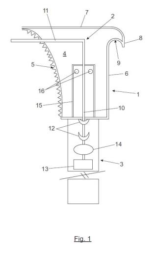 En cuanto al brazo guía es de trazado en "L" invertida, y va montado a través de uno de los tramos de la "L" sobre la pértiga, mediante guías que permiten su eslizamiento longitudinal. El otro tramo de la "L" está dirigido en dirección perpendicular a la pértiga y queda próximo y paralelo a la placa.