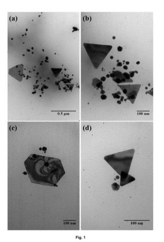 Figura 1: Imágenes realizadas mediante microscopia de transmisión electrónica (TEM) , realizadas con microscopio TEM de emisión de campo de 200kV modelo JEOL JEM-FS2200 HRP, de un extracto micelar obtenido por reducción de HAuCl4 en presencia de manzanilla (Chamaemelum nobile) (solución acuosa de 500 ppm de NP-Au) , donde se observan AuNPs de diferentes morfologías y tamaños: Fig. 1 (a) y Fig. 1 (b) AuNPs triangulares, hexagonales (triangular truncado) y esferoidales a dos ampliaciones (100000* y 250000*) ; Fig. 1 (c) partícula hexagonal de 360*240 nm, acompañada de pequeñas partículas esferoidales, de 30 nm de diámetro; Fig. 1 (d) dos nanopartículas de aspecto triangular, una de 60 nm y otra de 110 nm; y una decahédrica, de 40 nm, ubicada en la parte inferior izquierda.
