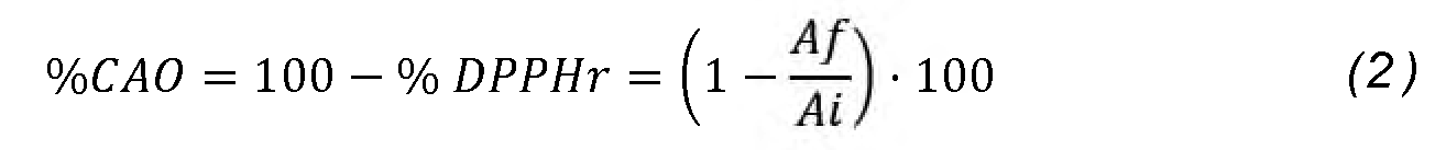 La capacidad antioxidante se calculó en función del DPPH remanente (DPPHr) empleando la ecuación 2, donde A f hace referencia a la absorbancia al final de la incubación, y Ai es la absorbancia inicial de la disolución de DPPH.