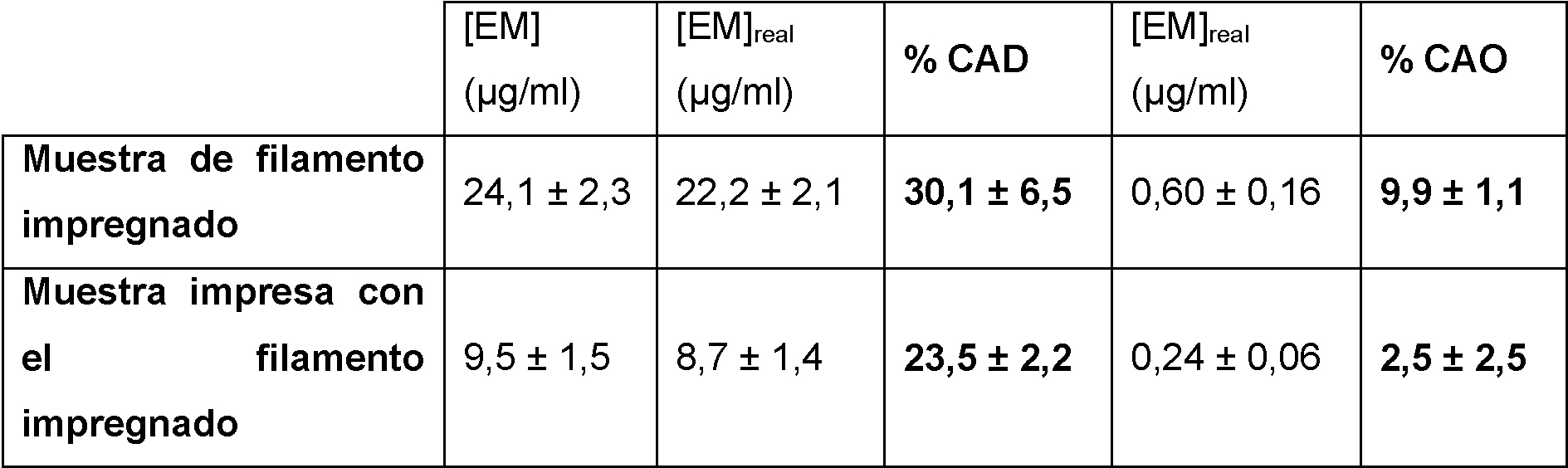 Puede observarse una menor tasa de liberación del extracto de mango desde la muestra impresa con respecto al filamento (figura 2) . Durante la SSI (impregnación con disolvente supercrítico) el CO2 en estado supercrítico (y el extracto disuelto en él) difunde por el interior del polímero aumentando su porosidad. En la fase de despresurización el CO2 en estado gaseoso escapa del interior del polímero mientras las partículas de extracto quedan atrapadas en los canales de difusión creados. Durante la fase de liberación, el extracto difunde al medio aprovechando estos canales de difusión. Sin embargo, durante la impresión 3D, el polímero se funde y se vuelve a solidificar modificando su estructura interna y destruyendo la porosidad alcanzada en la impregnación supercrítica, con lo cual al extracto atrapado en el interior del polímero le es más difícil difundir al medio de liberación. Si se considera el uso biomédico del producto, este resultado es muy positivo ya que permite obtener una cinética de liberación mucho más lenta, prolongando el efecto farmacoactivo del extracto durante ás tiempo.