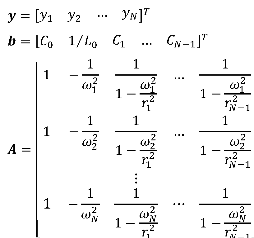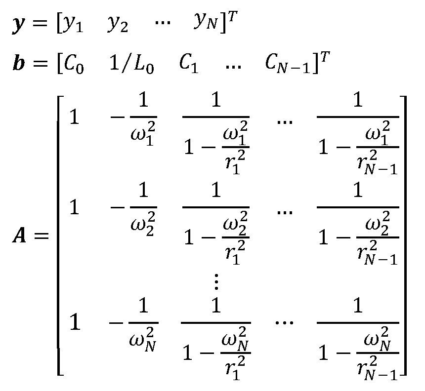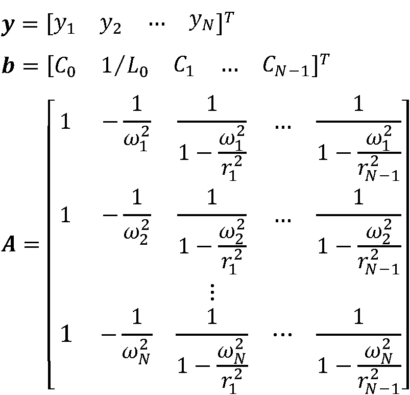 Nótese que el sistema matricial anterior tiene N ecuaciones y N + 1 incógnitas; esto es, las N - 1 capacitancias Ck de los condensadores (2) de las ramas LC (2) , la capacitancia C0 del condensador (3) de la rama C (3) , y la inductancia L0 de la bobina (4) de la rama L (4) . Para reducir el sistema a una matriz invertible U de tamaño N x N, se recurre a la capacitancia del condensador (3) de la rama C (3) , C0, como parámetro de control:
