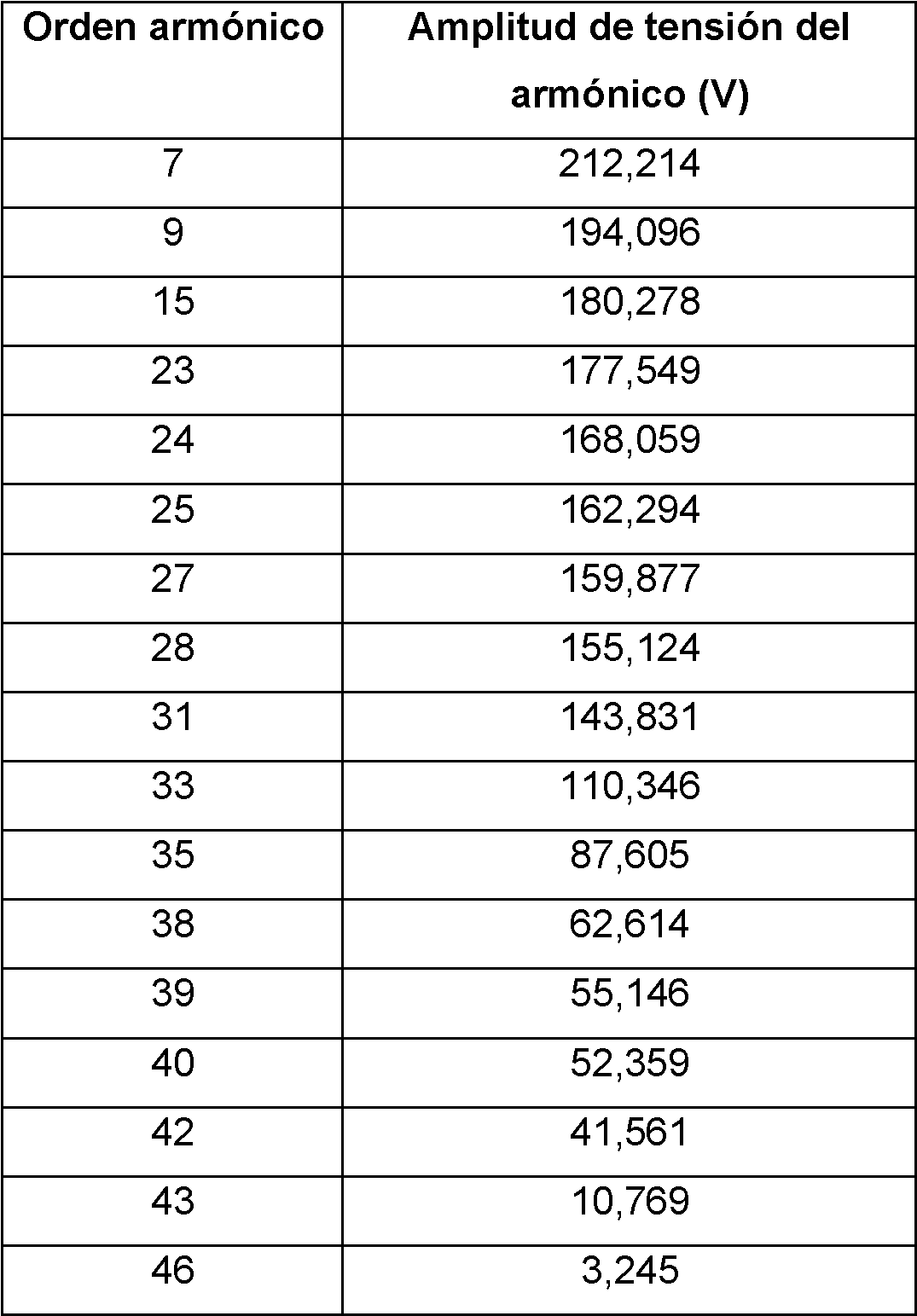Tabla 1. Ejemplo 2: Valores de tensión para cada armónico proporcionado por la fuente (5) .