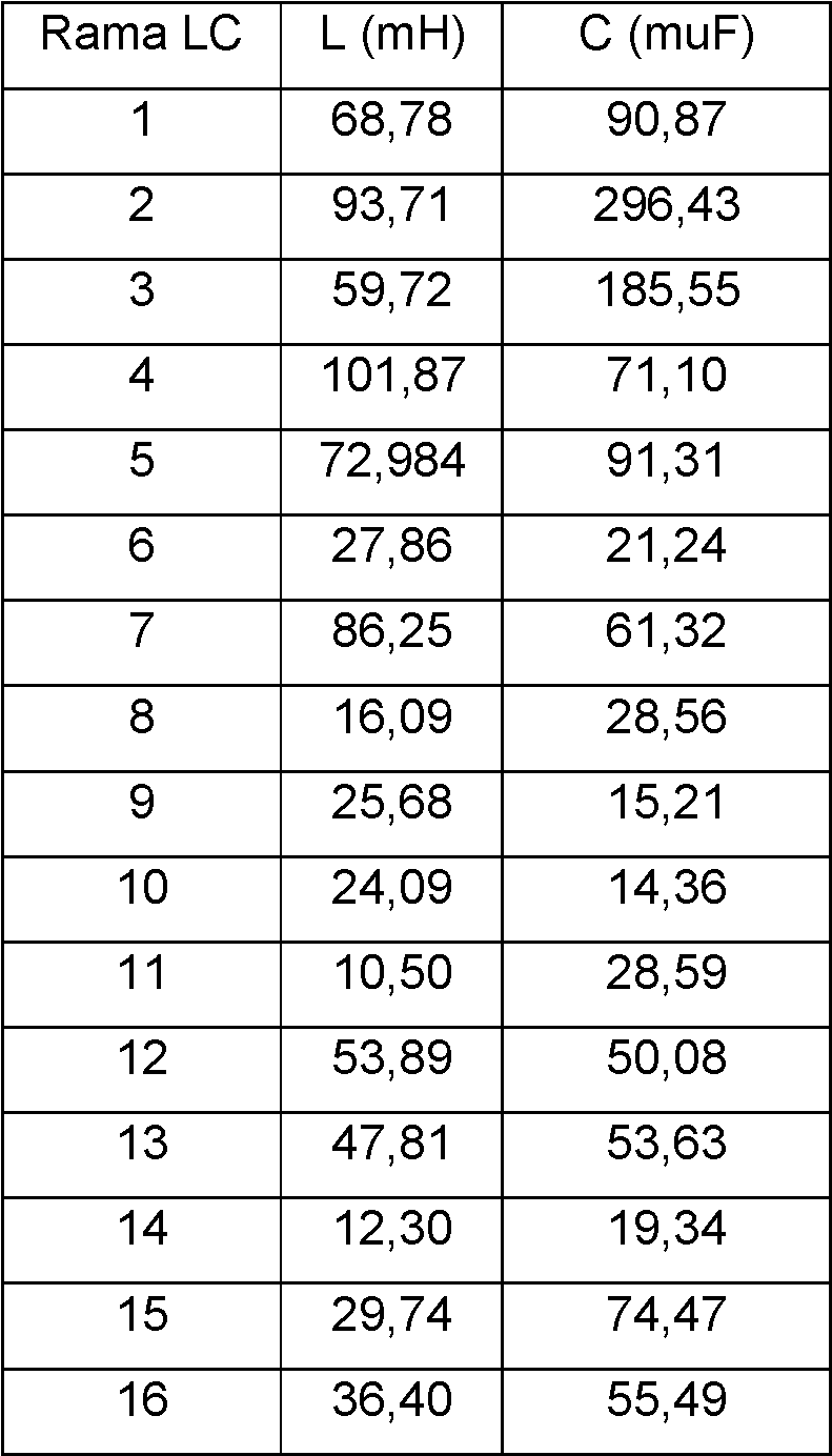 Los valores de la capacitancia del condensador (3) de la rama C (3) y de la inductancia de la bobina (4) de la rama L (4) conectados en paralelo a las 16 ramas LC (2) paralelo son C0 = 0 y L0 = 6.81 mH, respectivamente.