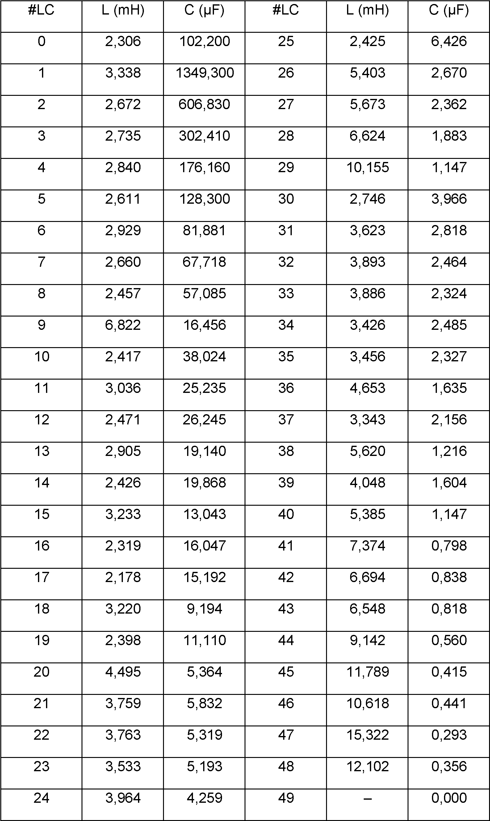 Tabla 3. Ejemplo 2: Ramas LC del dispositivo (1) compensador de la invención.